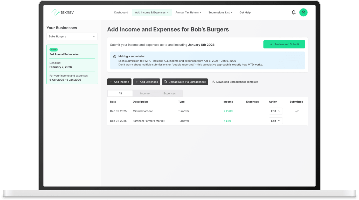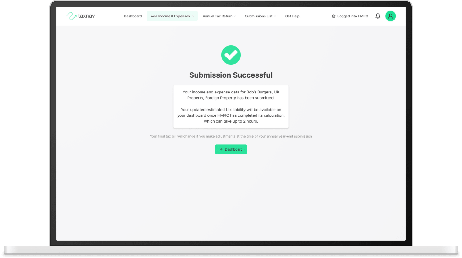 TaxNav totals your figures and shows your estimated tax bill in real time after submission to HMRC.